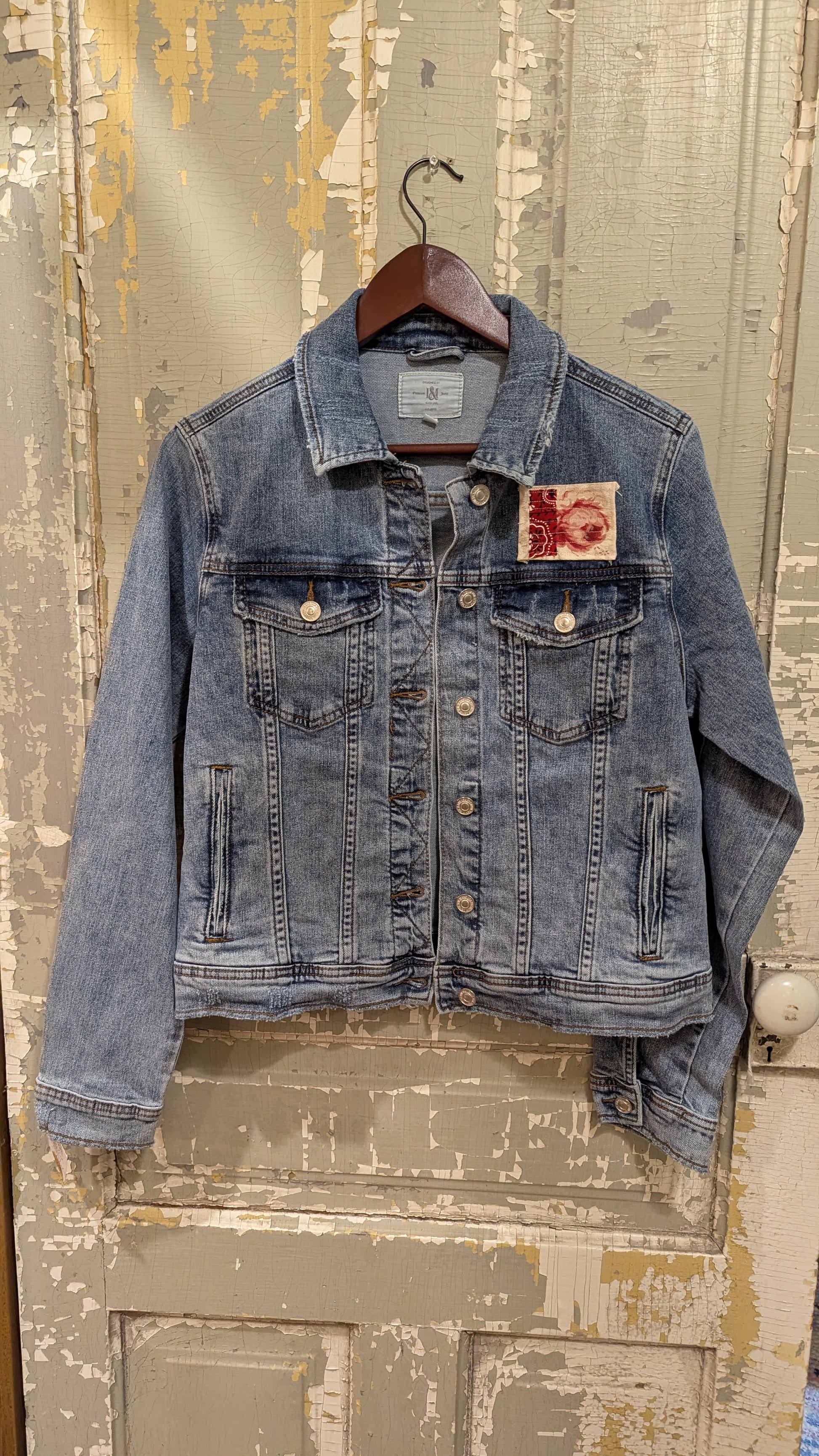 A hand-stitched "Upper Peninsula" graces this classic denim jean jacket - embellished for you right here in St. Ignace, in the Upper Peninsula (aka The U.P., or "The Yoop.") We individually craft these ourselves, using a variety of brand new jackets or sometimes great-condition upcycled (thrifted) ones, plus our stash of a wide range of interesting fabrics (both vintage and new). See the photos, the jackets in the collection are all different, and yours will be one-of-a-kind!