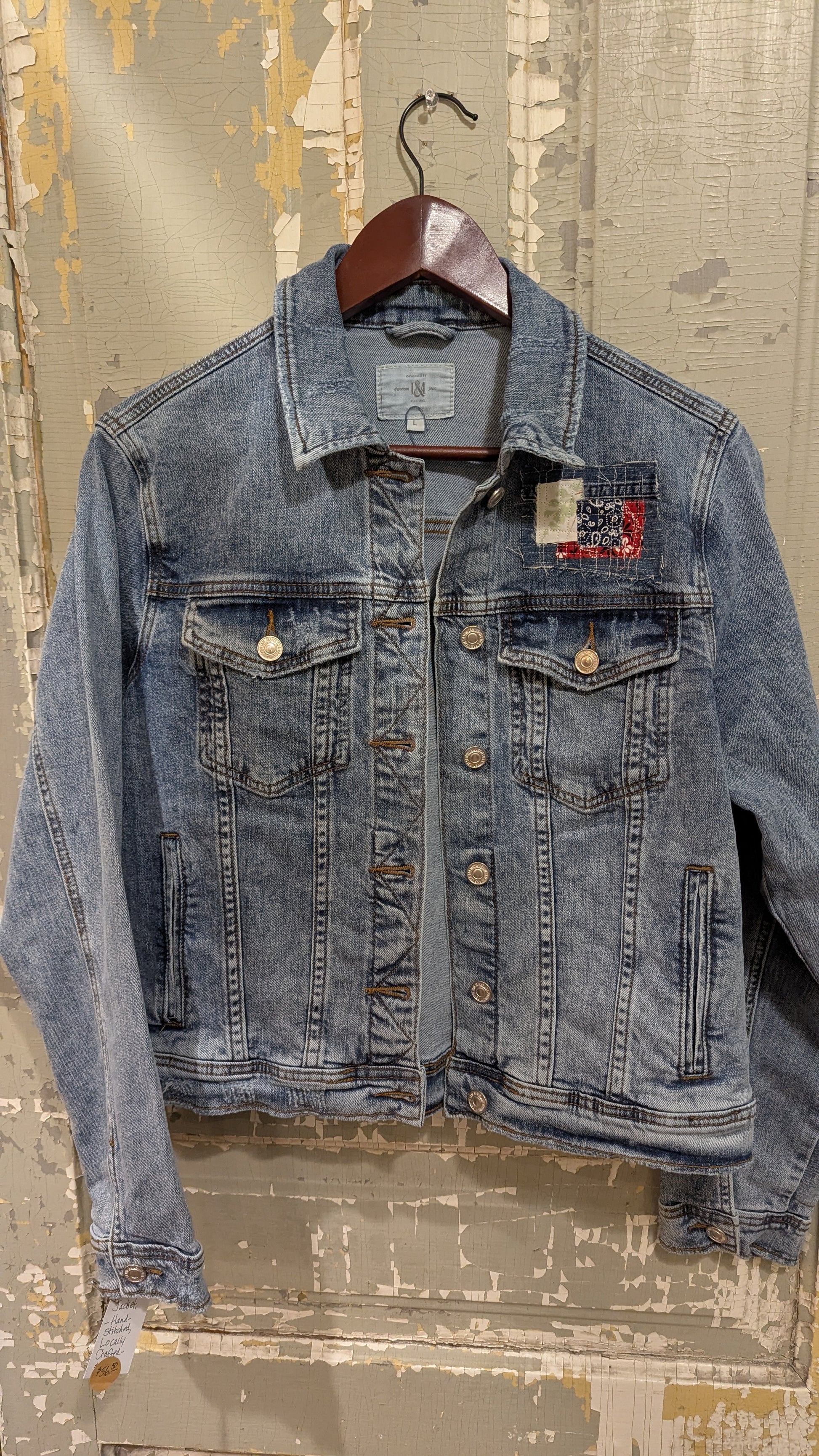 A hand-stitched "Upper Peninsula" graces this classic denim jean jacket - embellished for you right here in St. Ignace, in the Upper Peninsula (aka The U.P., or "The Yoop.") We individually craft these ourselves, using a variety of brand new jackets or sometimes great-condition upcycled (thrifted) ones, plus our stash of a wide range of interesting fabrics (both vintage and new). See the photos, the jackets in the collection are all different, and yours will be one-of-a-kind!