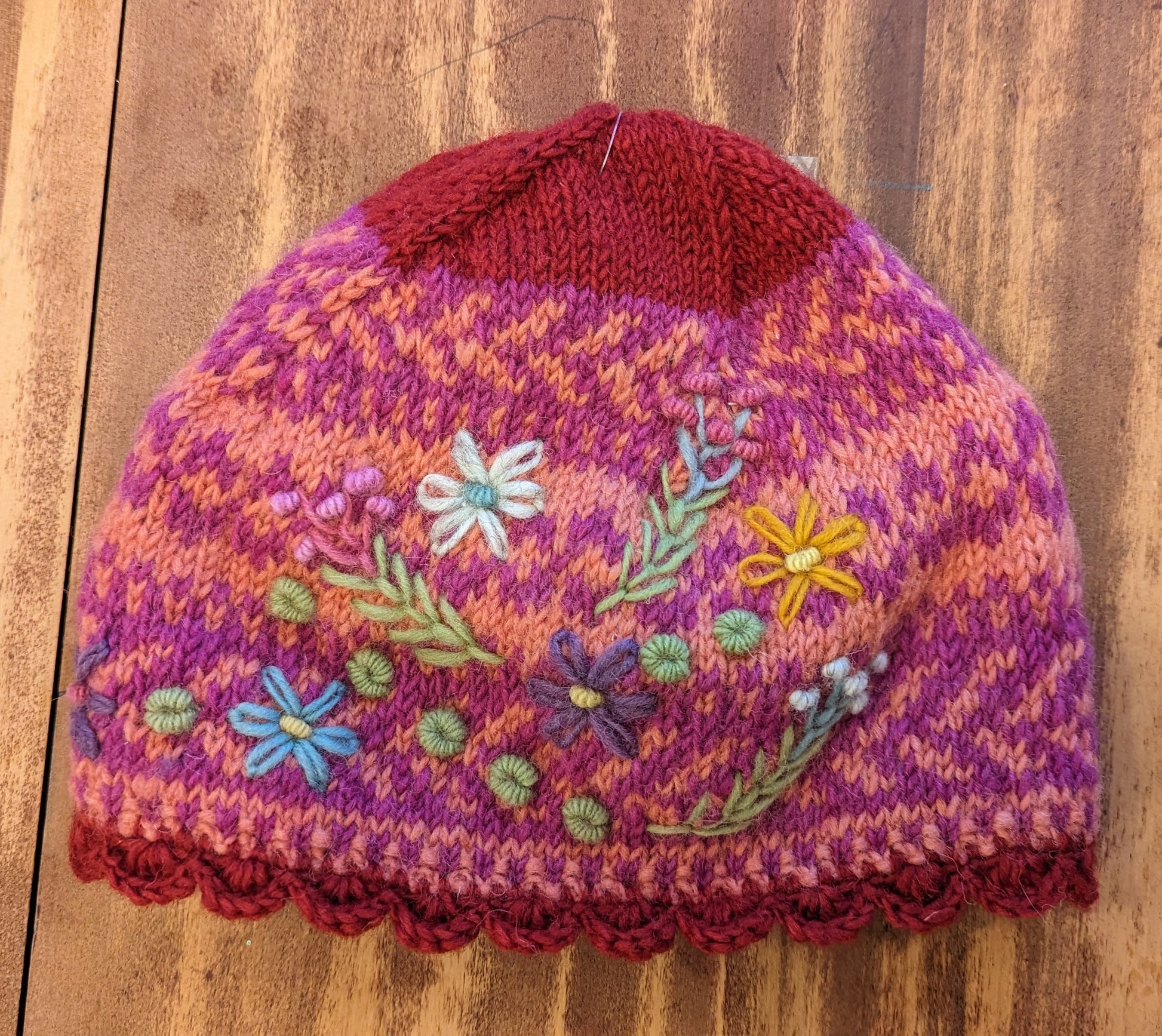 Hand-knit and embroidered by Lost Horizons Knitwear. Fleece lined band inside for comfort and warmth.