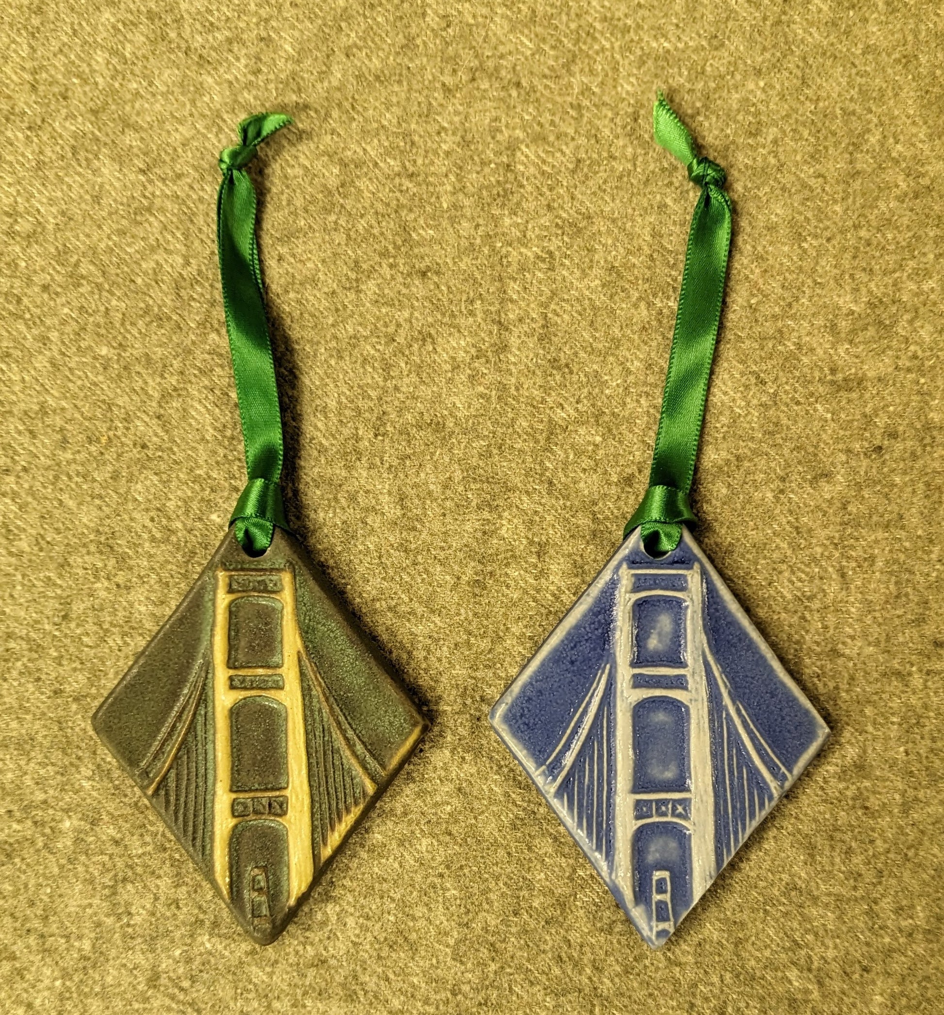 Choose Blue or Matte Green for this Mackinac Bridge ornament. Measures 4 inches. Handcrafted in northern Michigan by artists at Little Traverse Tileworks.