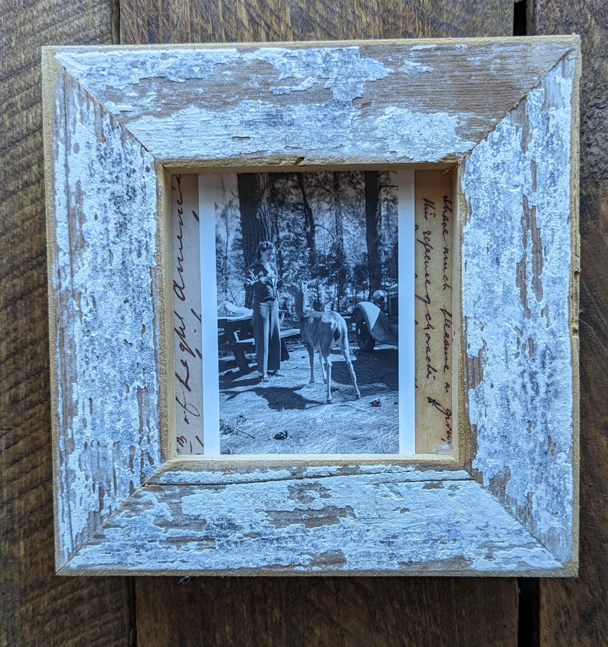 "Feeding a Deer." This authentic old black and white original photograph (not a print) in reclaimed barnwood frame will be a perfect little addition to your camp or cabin. See photos. A bit of old handwritten notes accent the edges. Frame measures 6 x 6 inches, no glass, and has a hanger on back. It's ready for a spot on your wall.