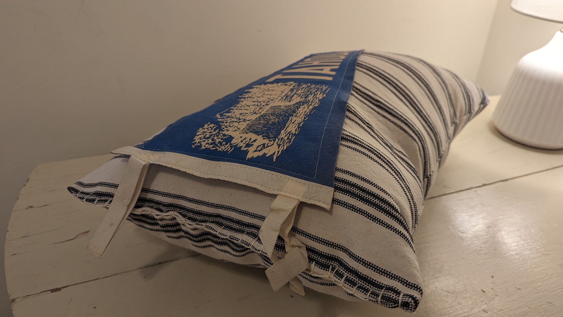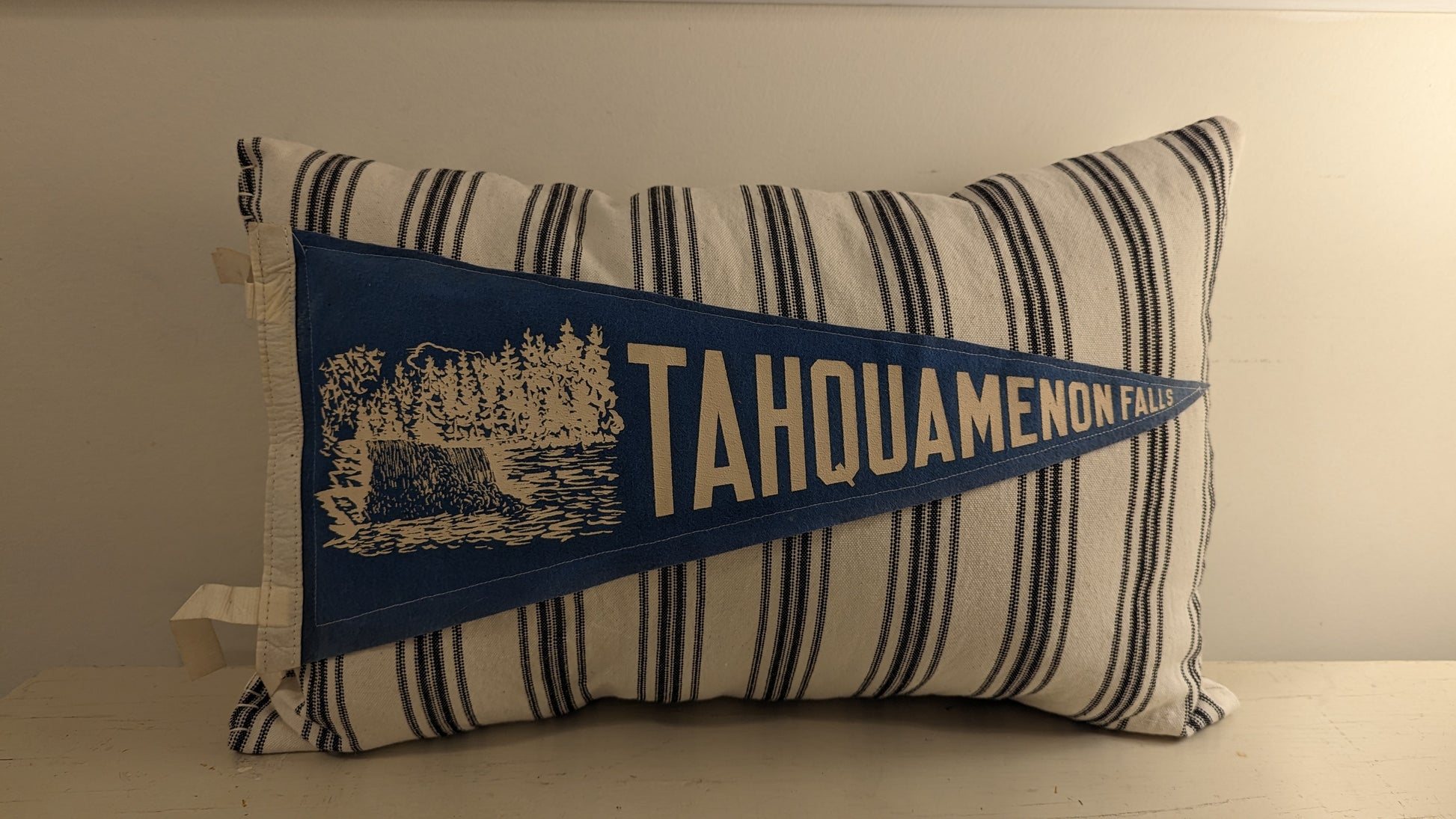 Pillow handcrafted from an antique Tahquamenon Falls travel pennant combined with striped cotton fabric. These old pennants evoke Upper Peninsula vacation memories of years gone by! Measures approximately 18 inches by 11 inches. Made in St. Ignace. Ready for your cozy home, cottage, or cabin!