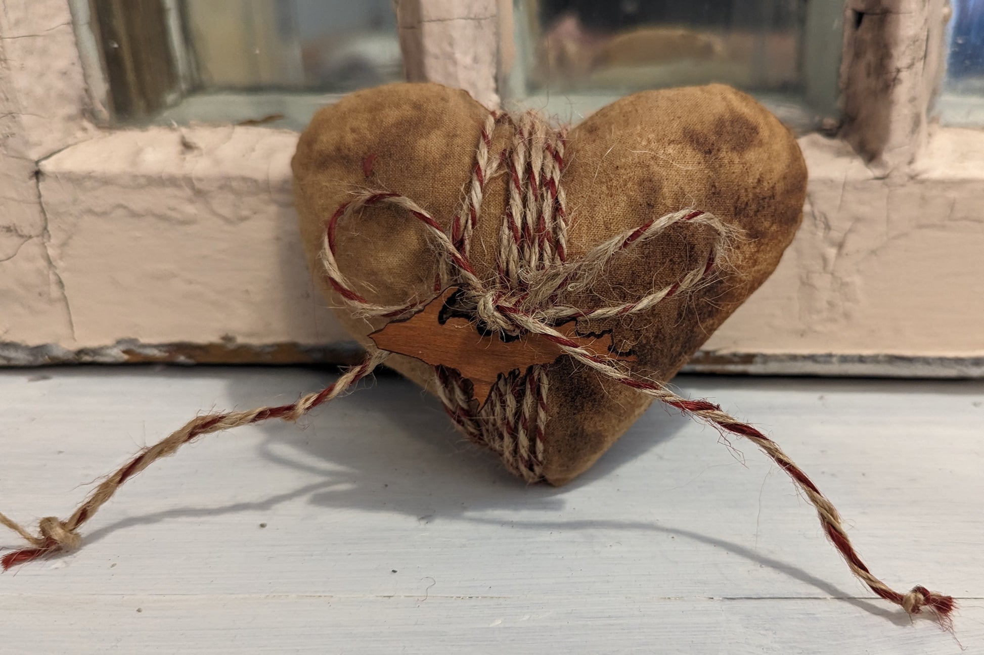 A wee heart pillow, handcrafted from tea-stained fabric, and all dressed up with little details! A great antique primitive look. Size is 4 inches across. Fill a bowl or basket with them, set a couple on a shelf, or give one to your sweetheart!