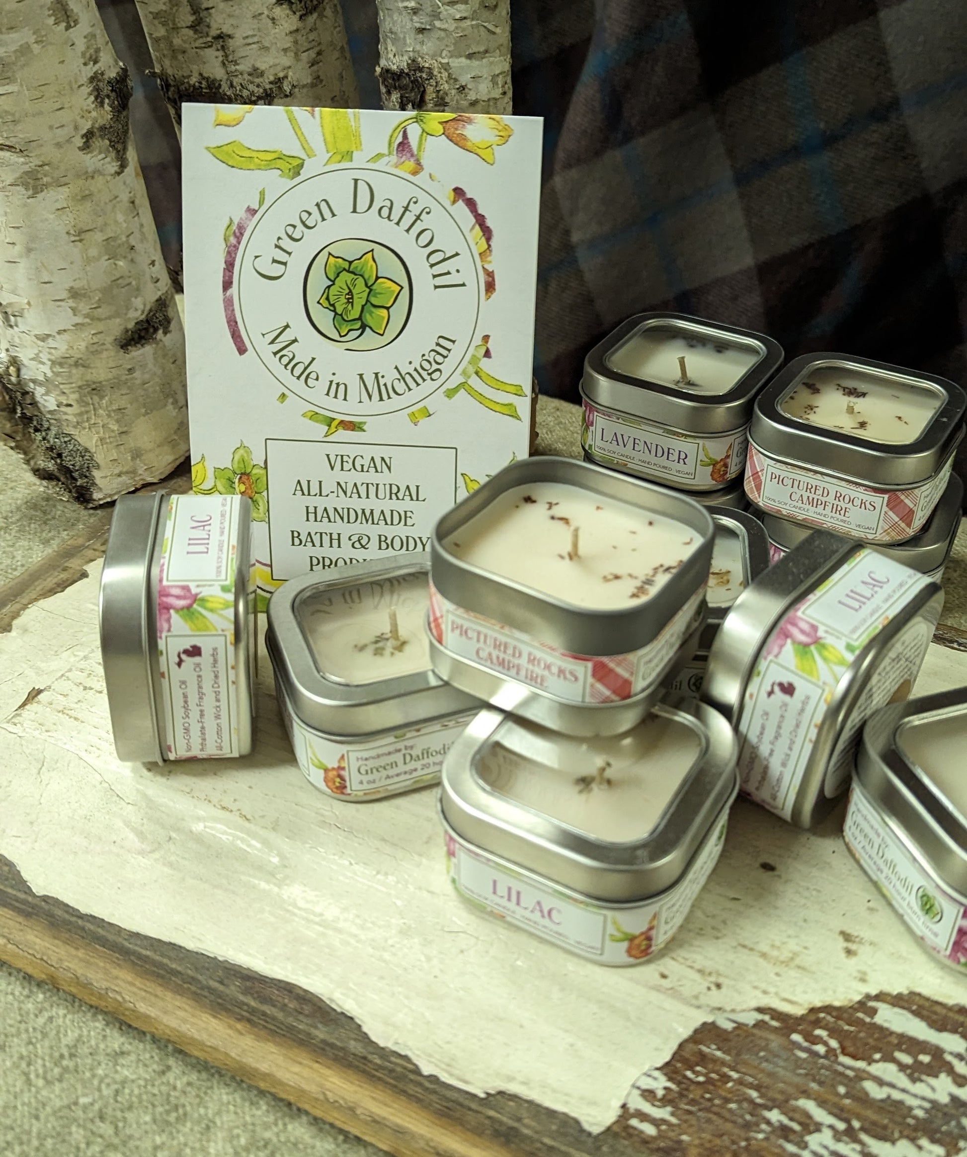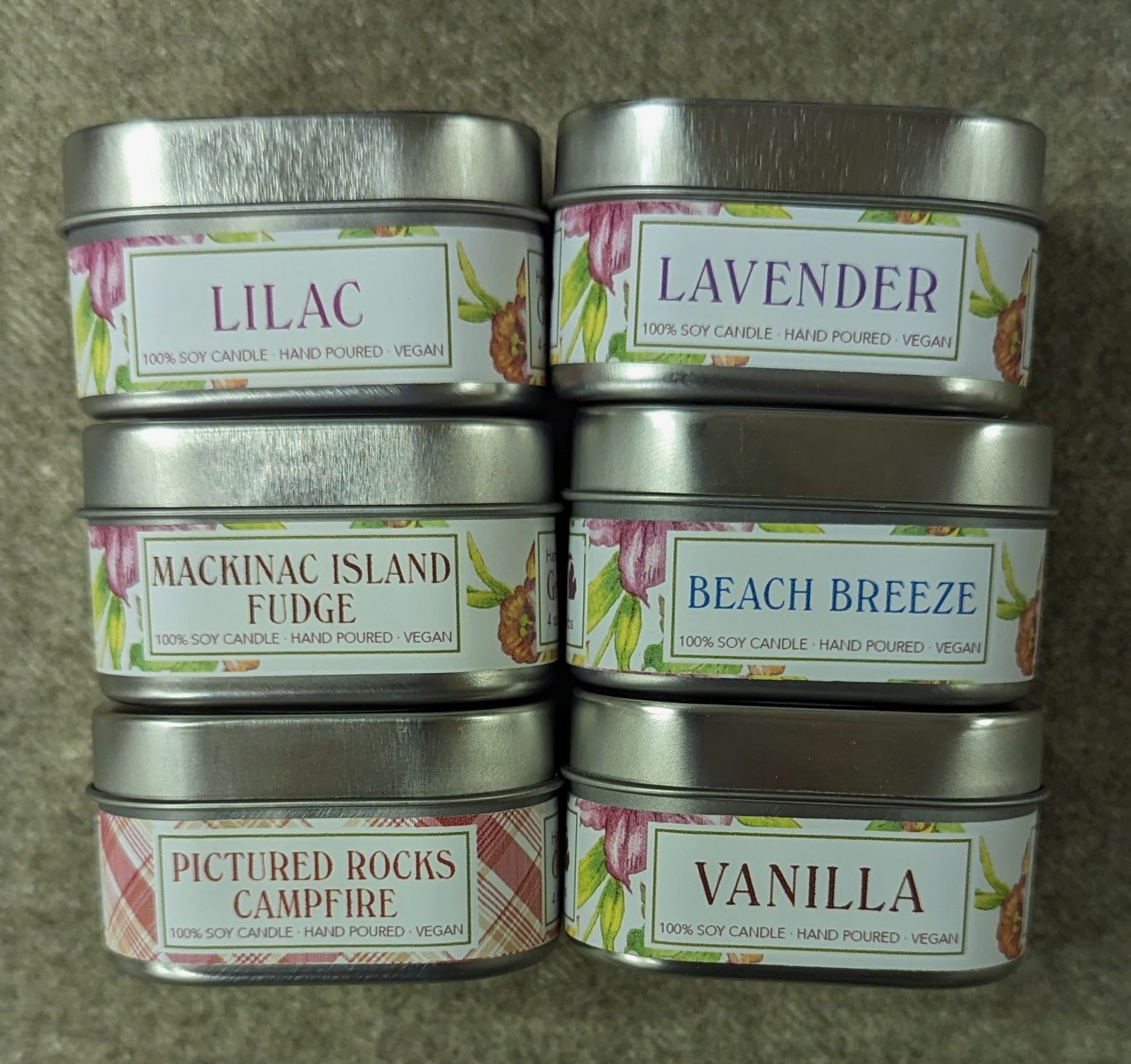 Scented candles, made in Michigan, with your favorite scents: Lilac, Mackinac Island Fudge, Pictured Rocks Campfire, Lavender, Beach Breeze, or Vanilla. Handmade vegan candles.