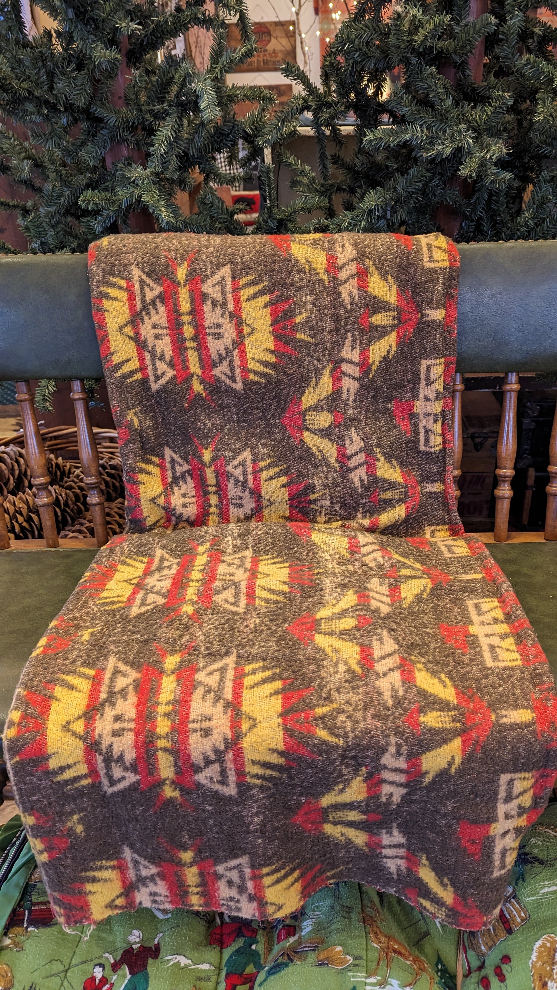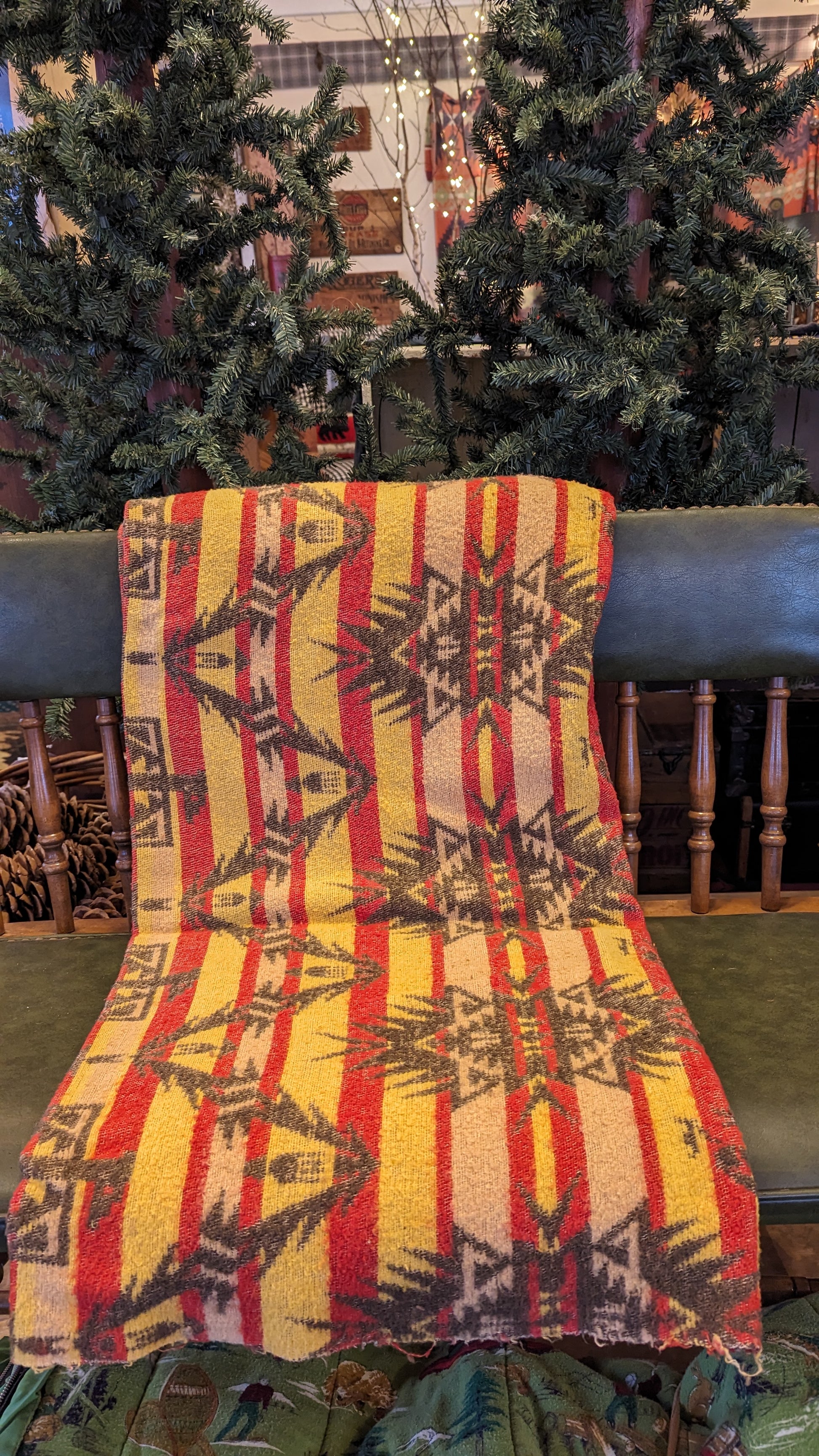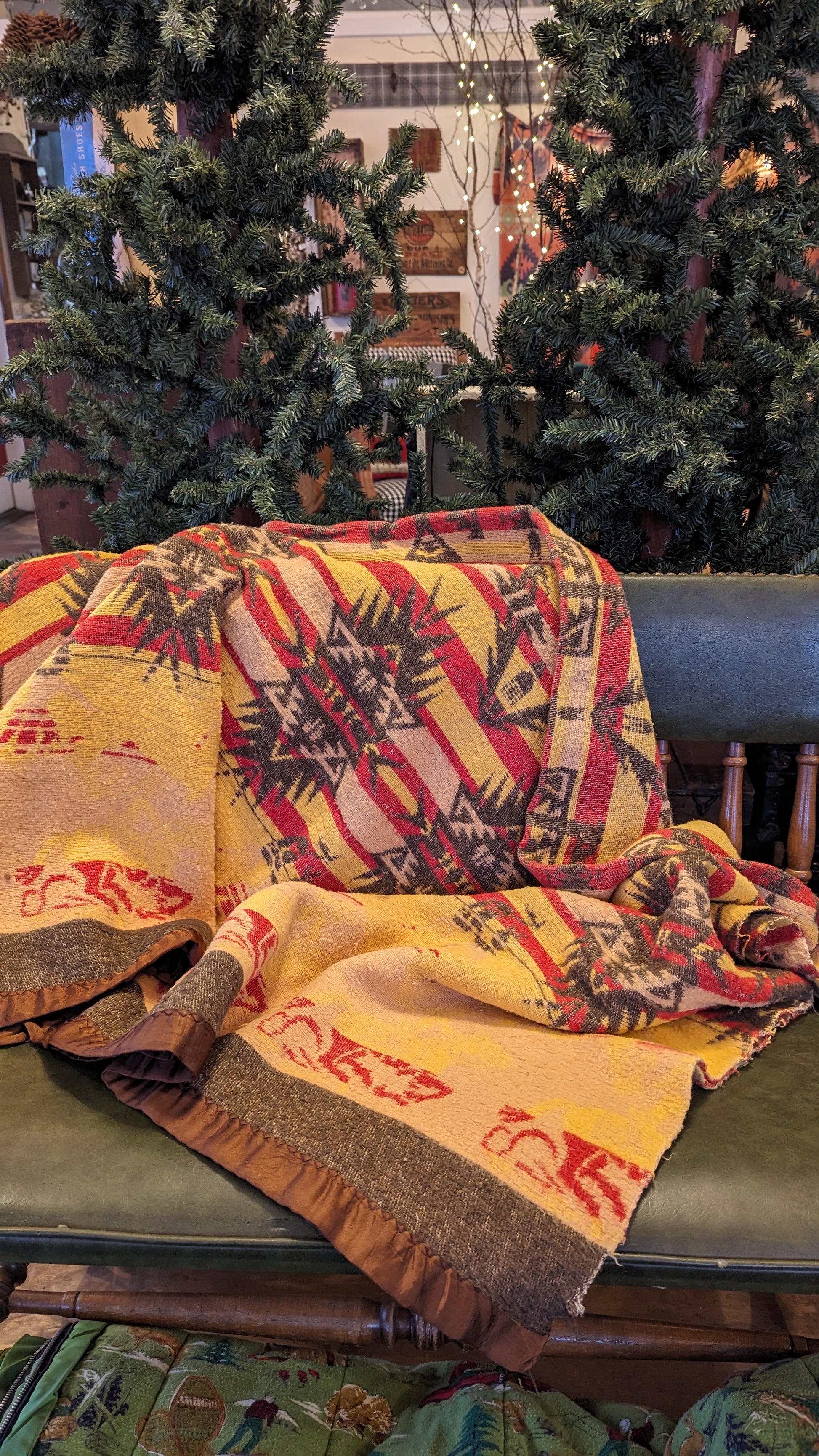 A beautiful old blanket in a Native American inspired "trade blanket" design. It is mid-century vintage, not new, and has wear as expected for its age - but is in good vintage condition. These old collectible blankets are getting so hard to find! Colors are primarily yellow, brown, with some red. Reversible so one side shows more yellow, the other side more brown. Cotton blend. Brown satin binding on two ends. What a lovely find for your home, lodge, camp, cabin, cottage!