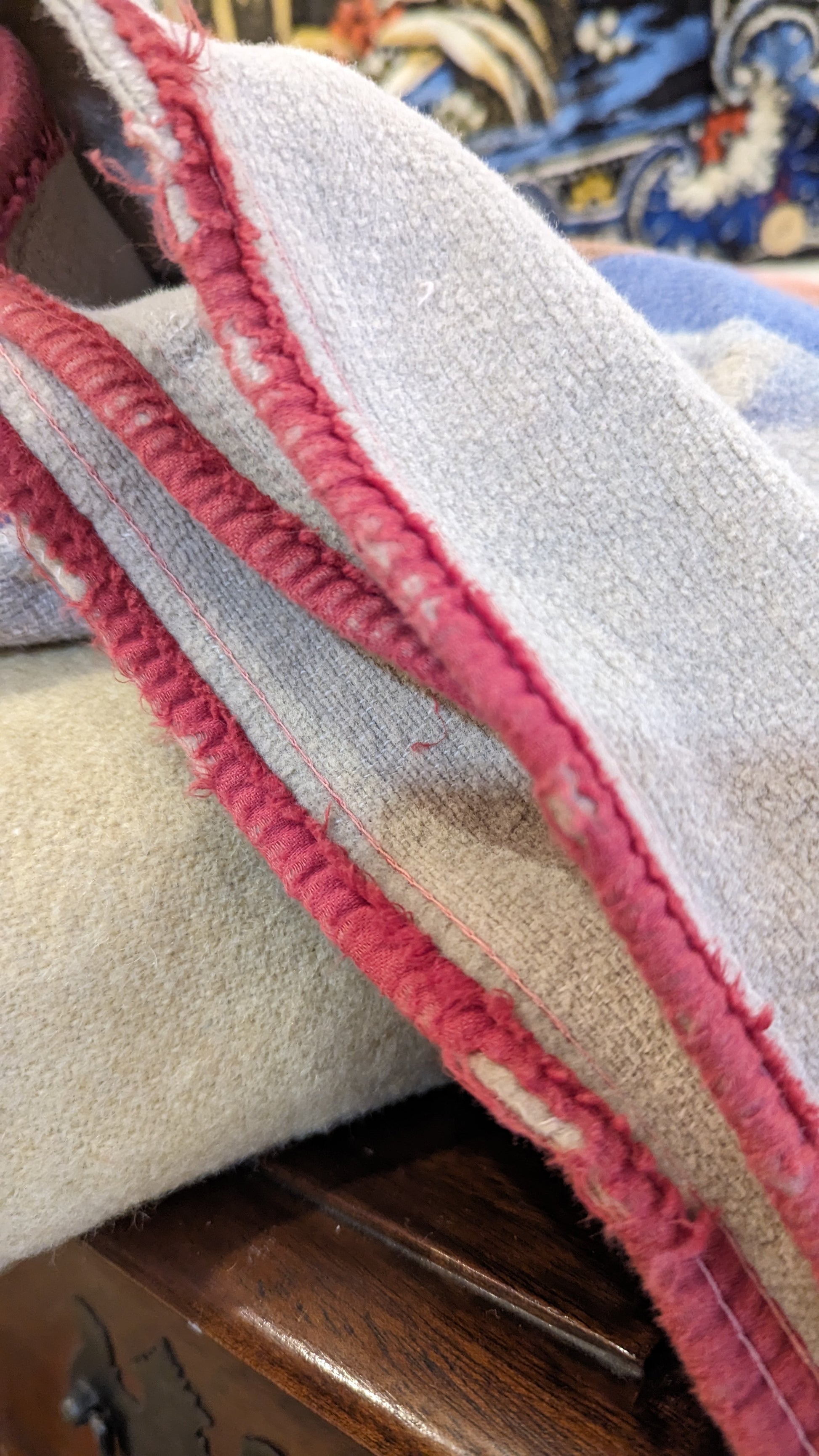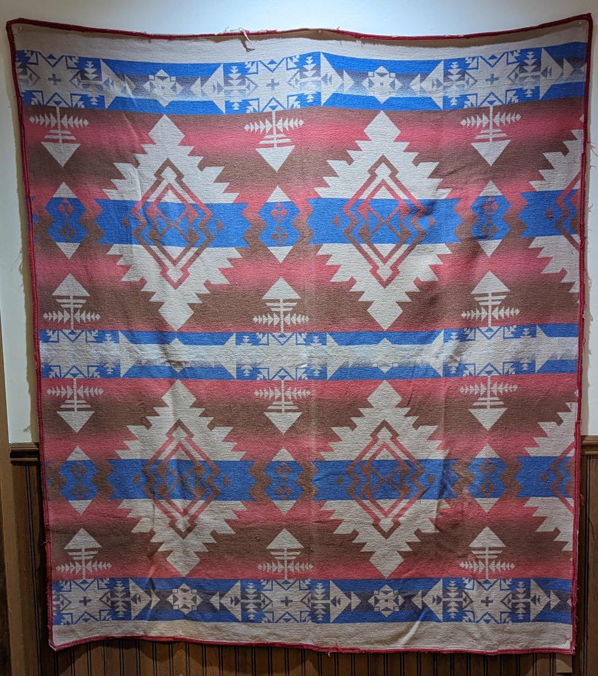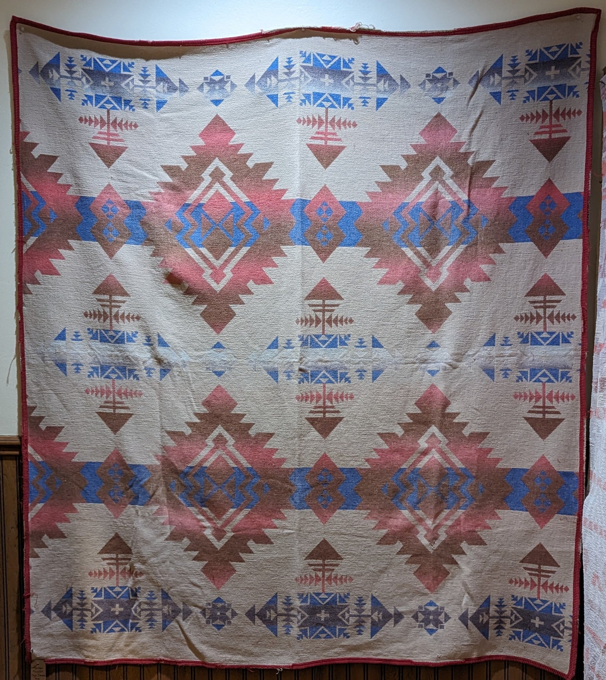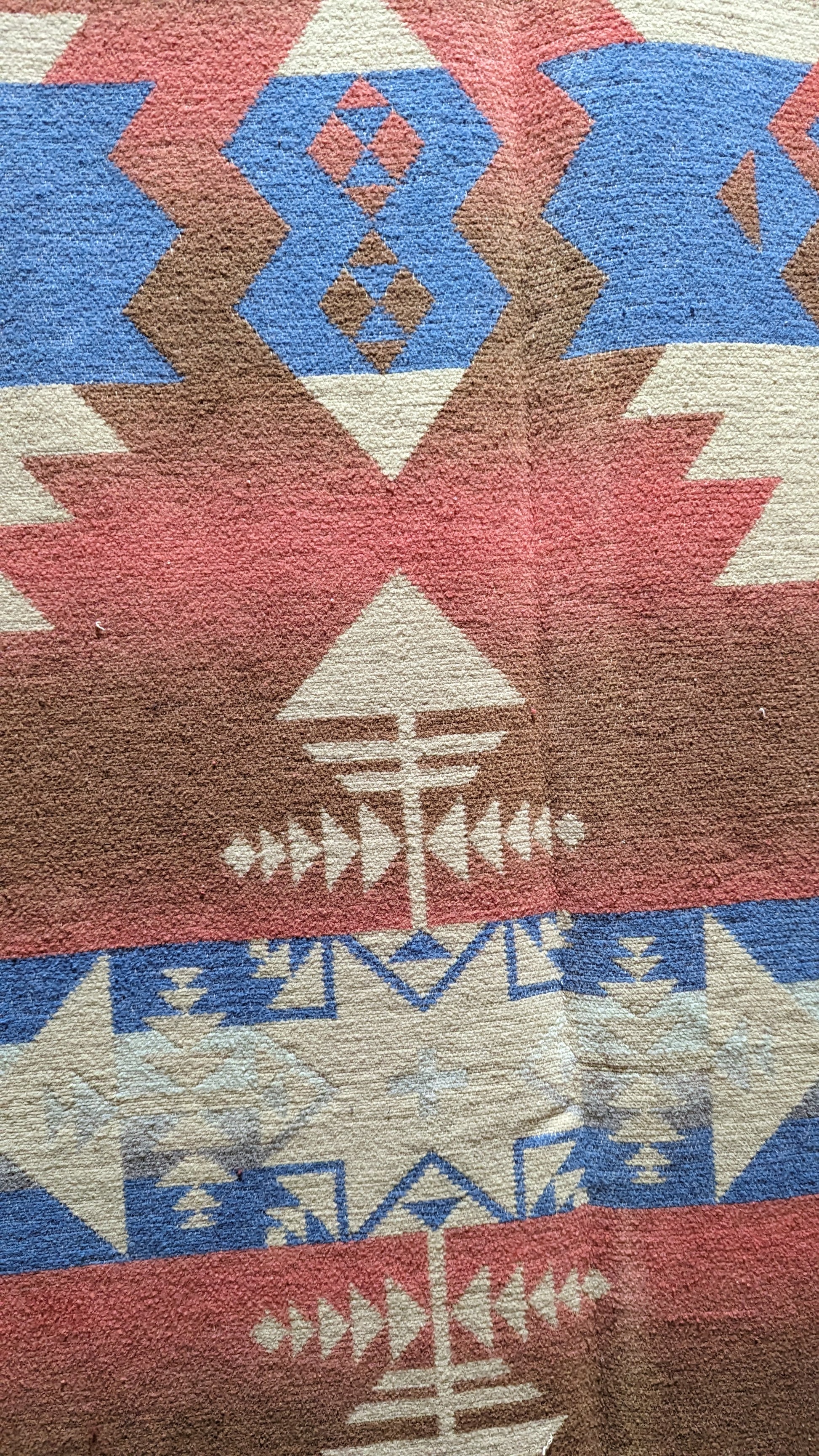 A vintage, soft, trade-style blanket from mid-20th century in muted colors of beige, red/brown, and blue. Reversible, photos show both sides and a closeup of pattern, as well as frayed edges. Measures 68 inches by 62 inches. Ready for your cozy home, cottage, or cabin!