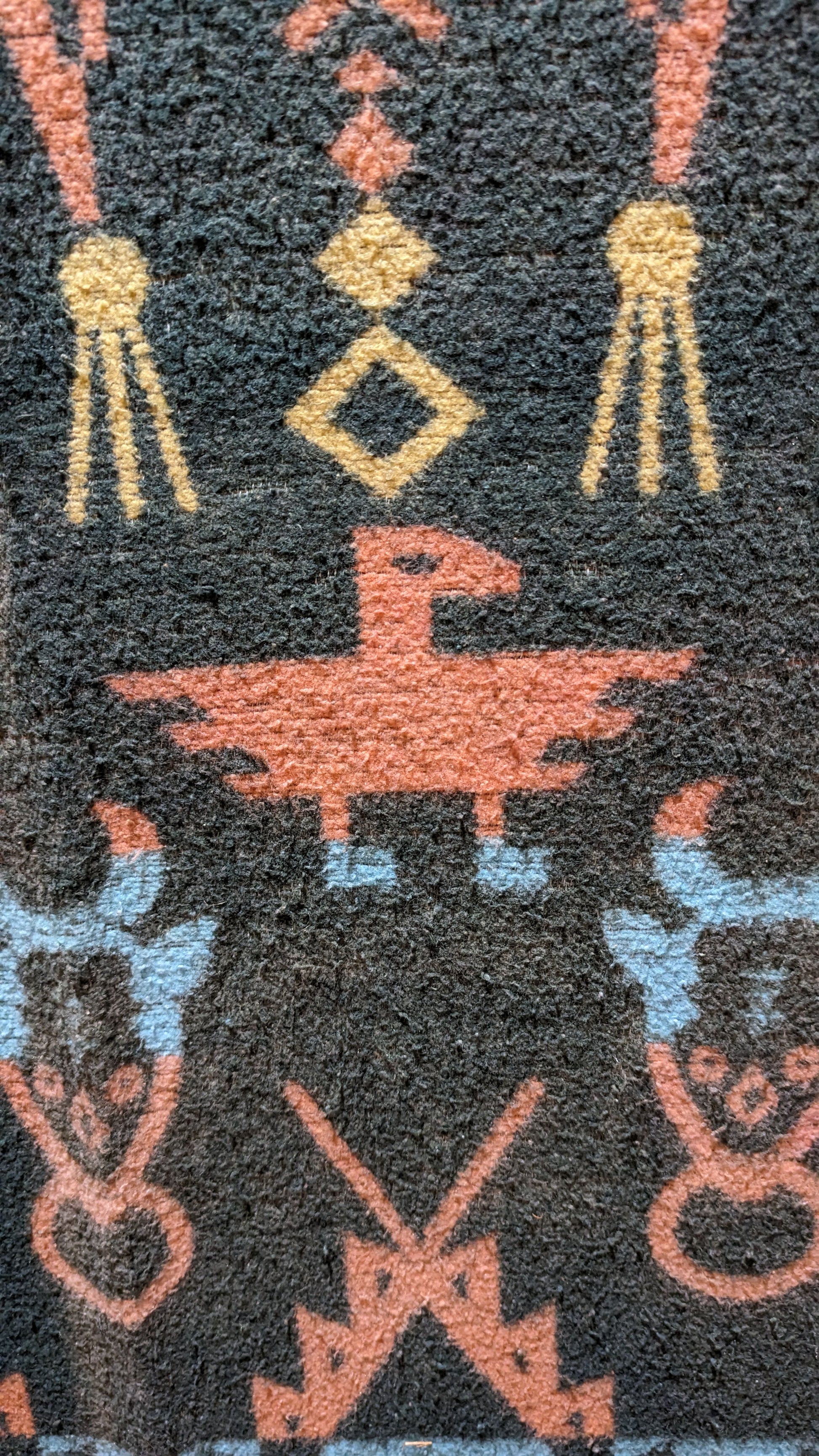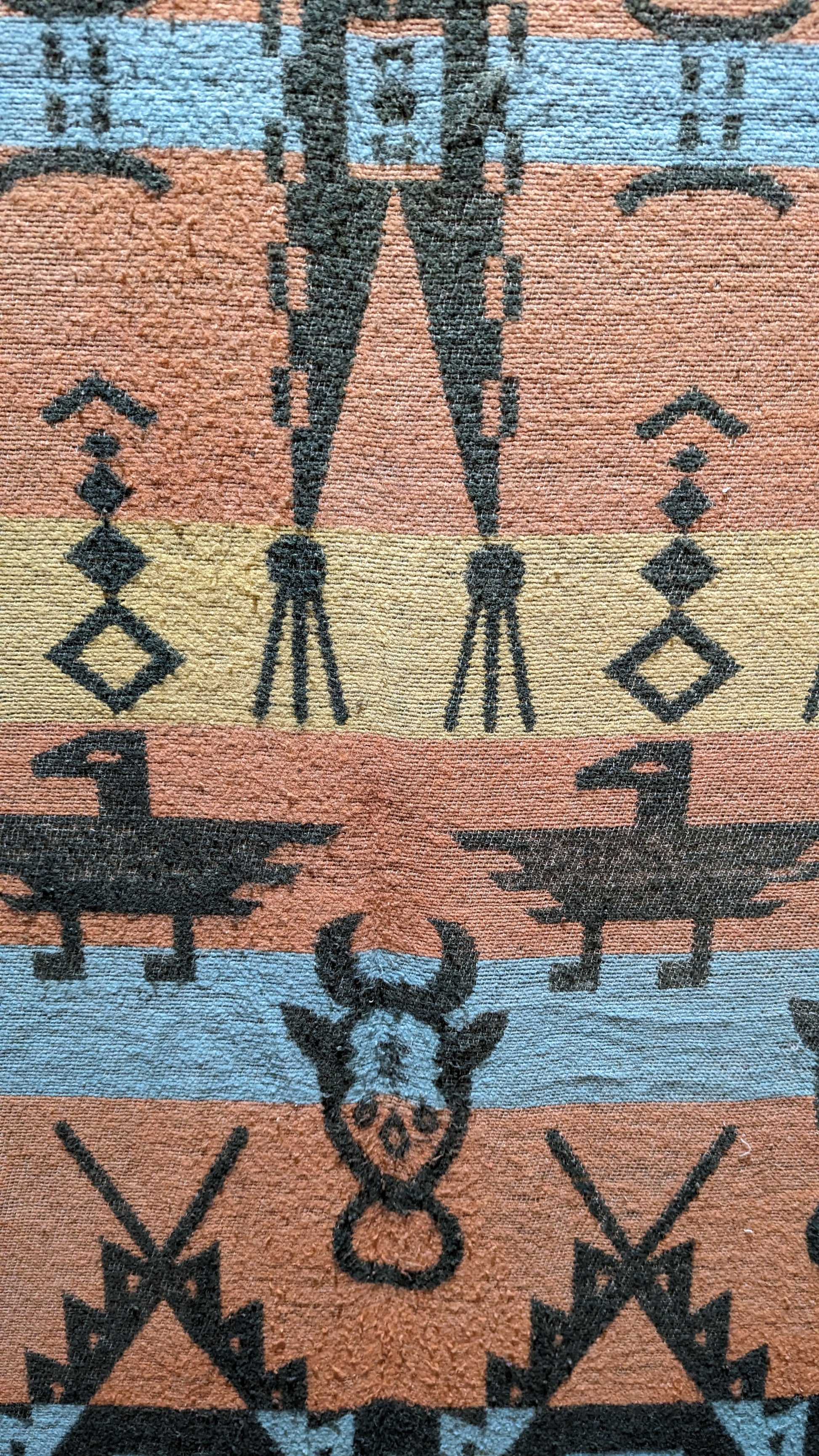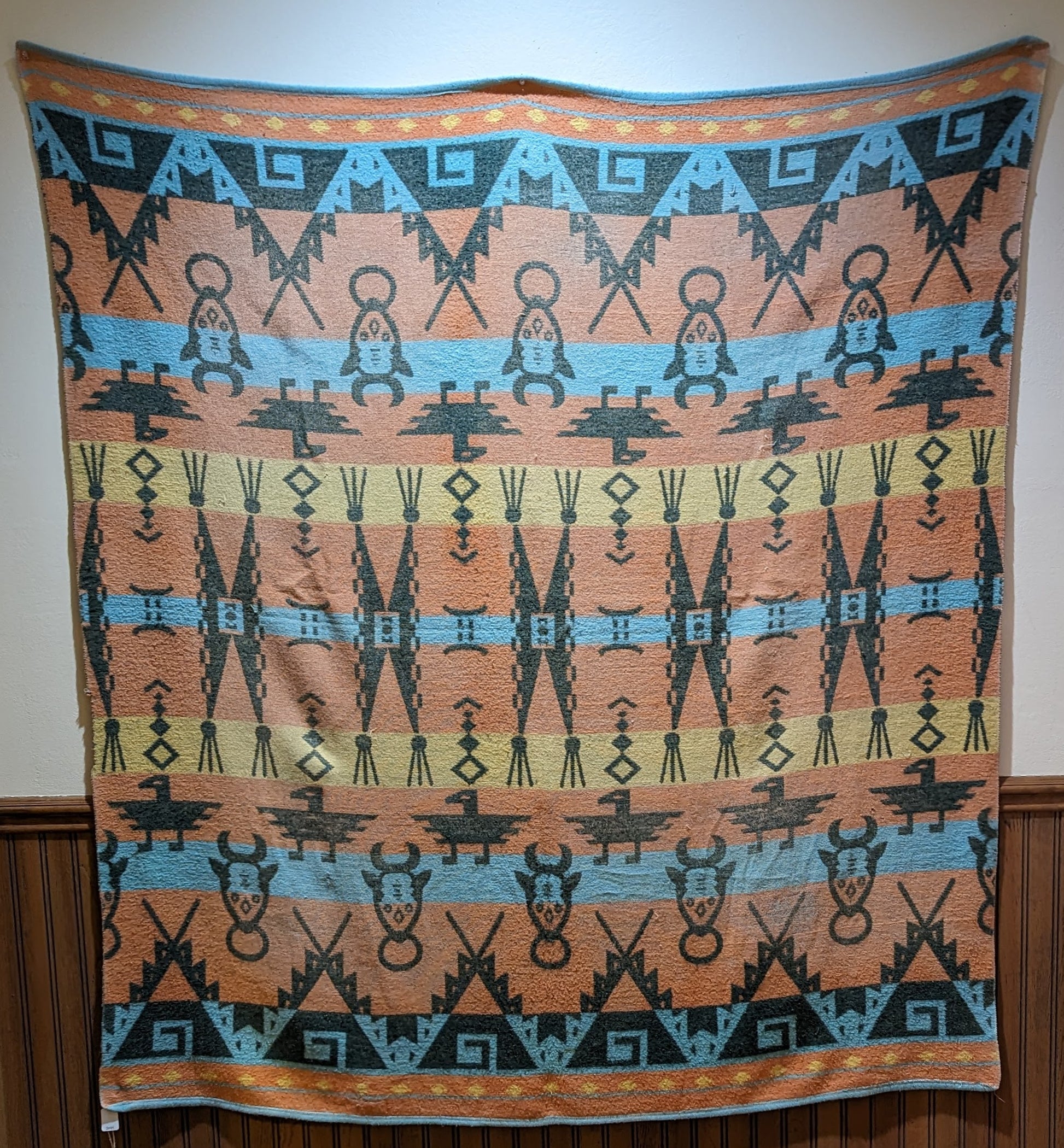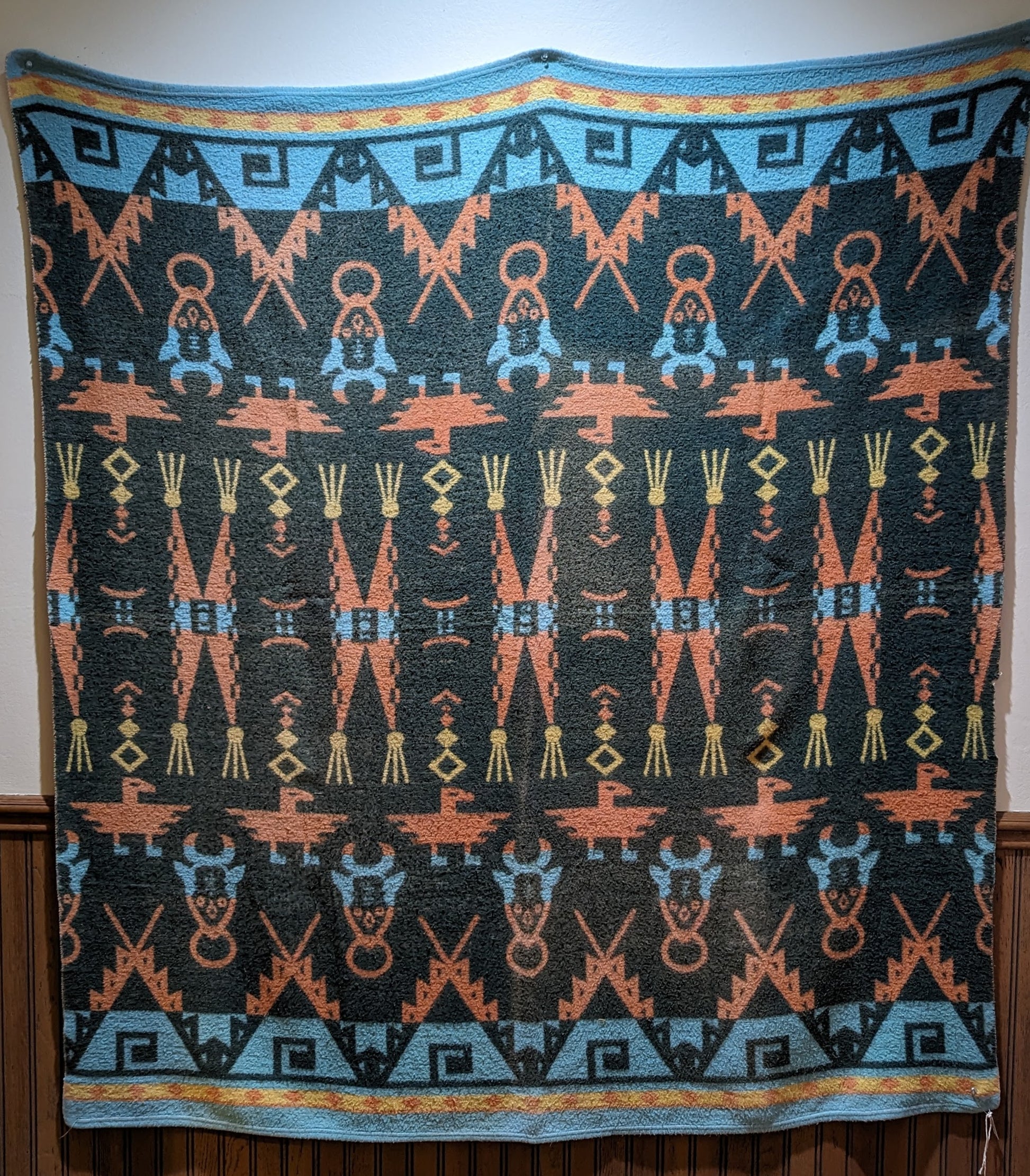 A vintage, soft, trade-style blanket from mid-20th century in appealing colors of dark green, turquoise, pink. Native American thunderbird design. Reversible, photos show both sides and a closeup of pattern, as well as two small pinholes in the blanket. Measures 62 inches by 57 inches. Ready for your cozy home, cottage, or cabin!