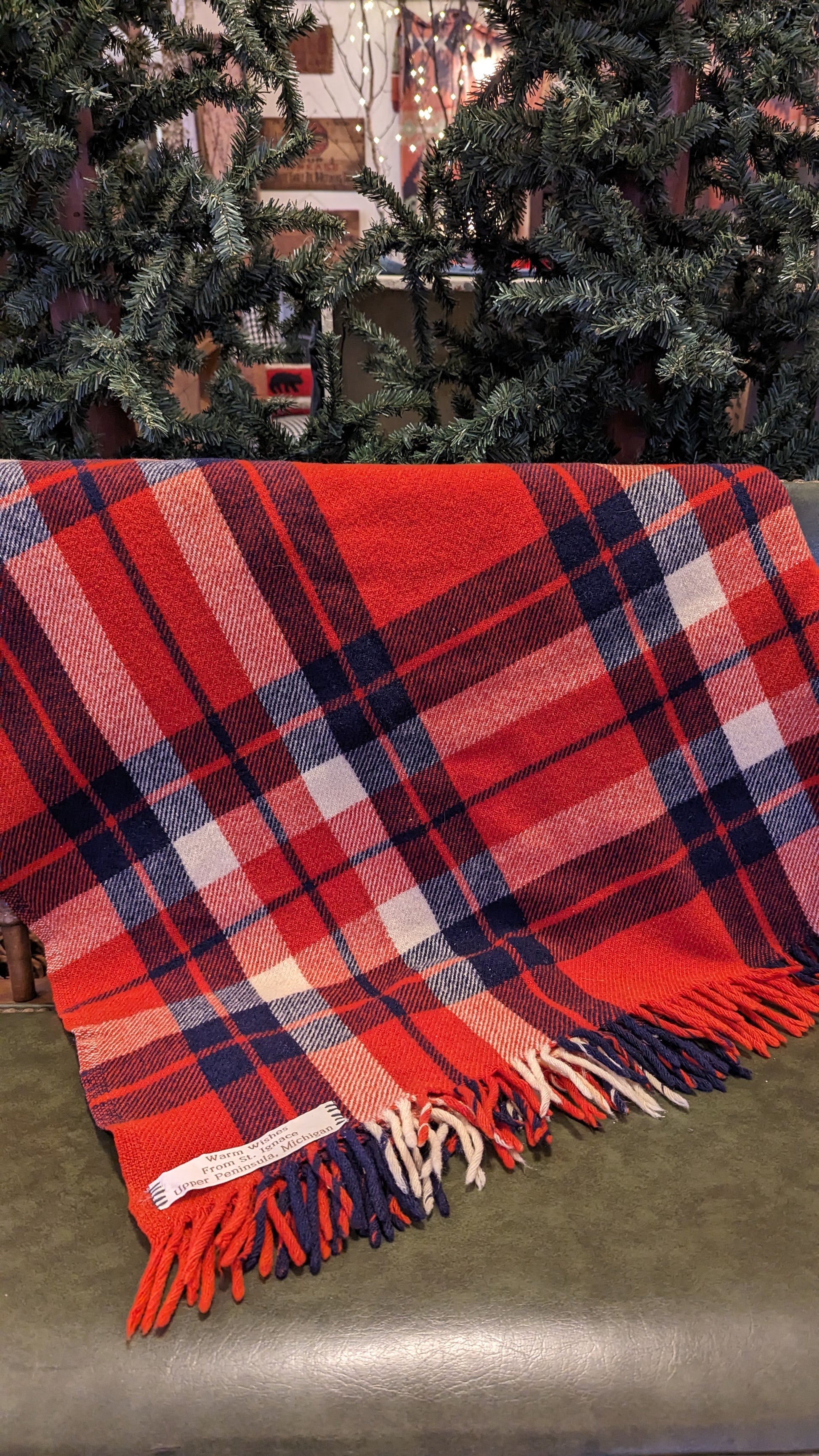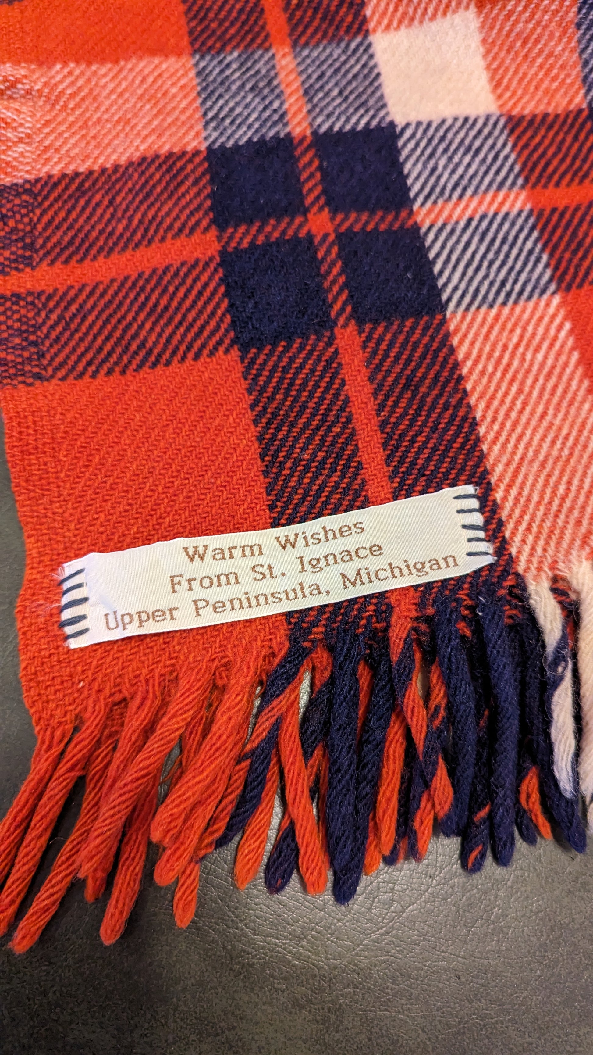 Mid-century vintage wool blanket / throw with fringed ends. Colors are red and blue plaid. Custom Labeled: "Warm Wishes from St. Ignace, Michigan Upper Peninsula." In very good vintage condition. Enjoy at the tailgate or cookout, or at home, cabin, camp or cottage!