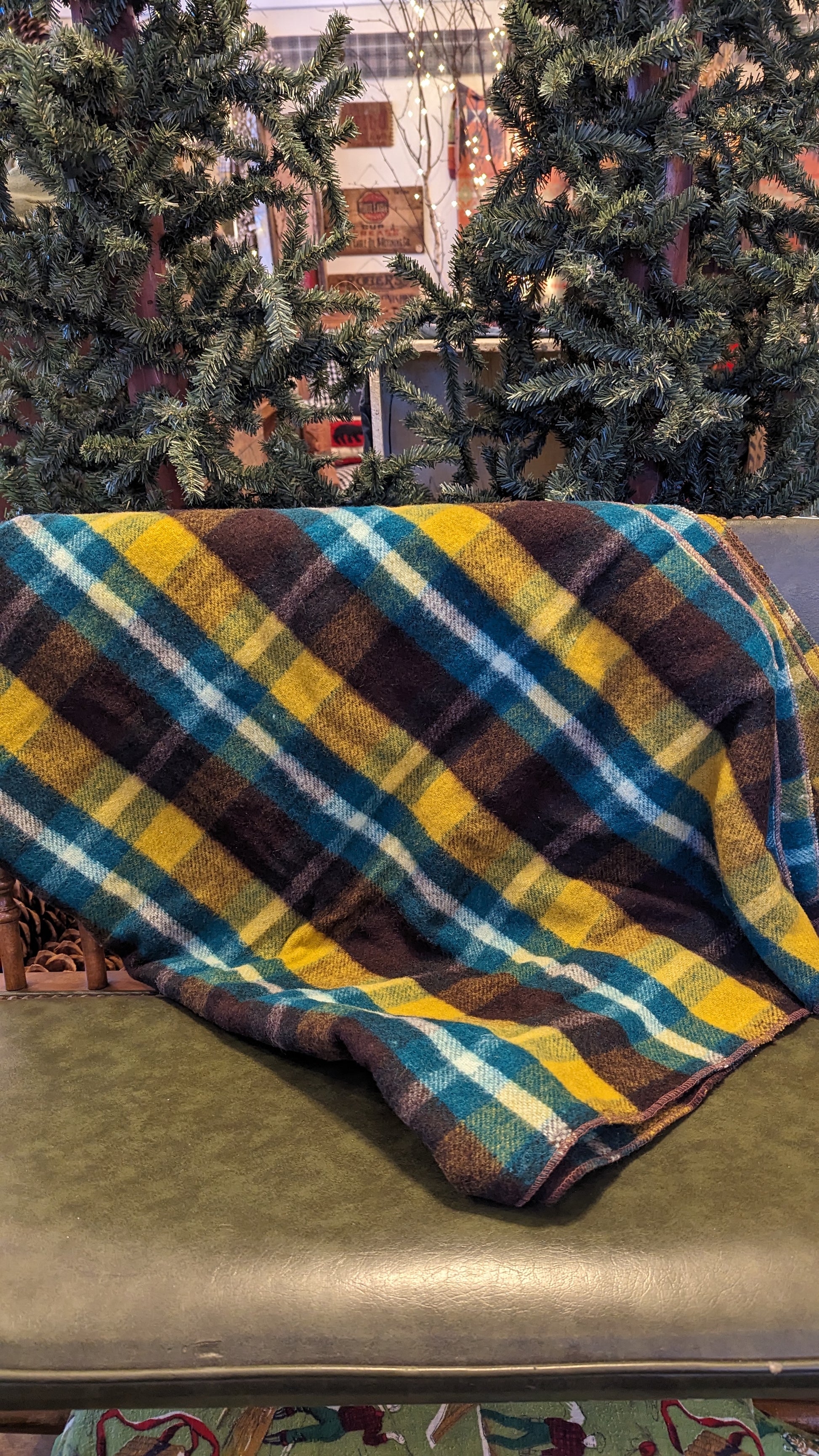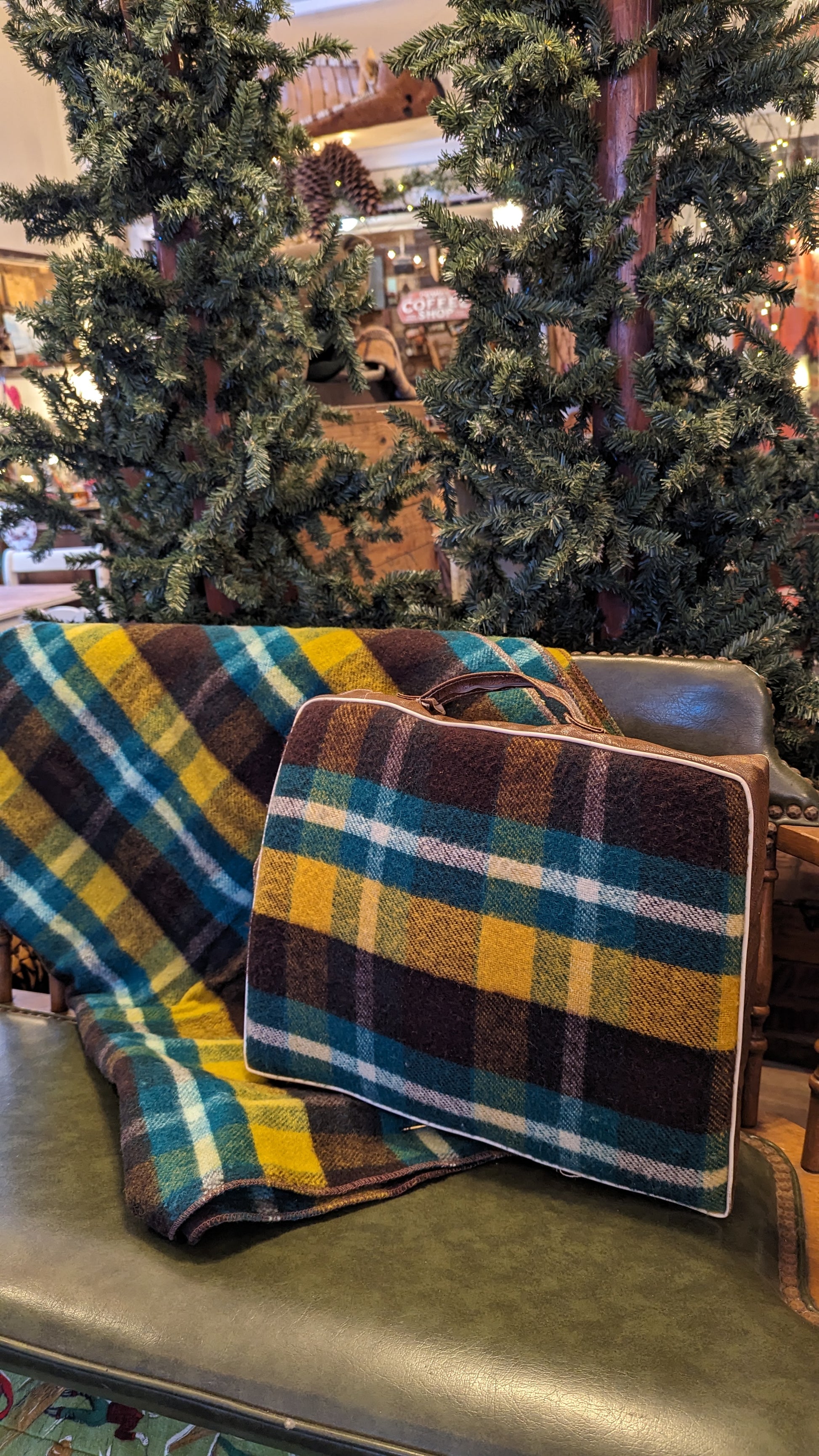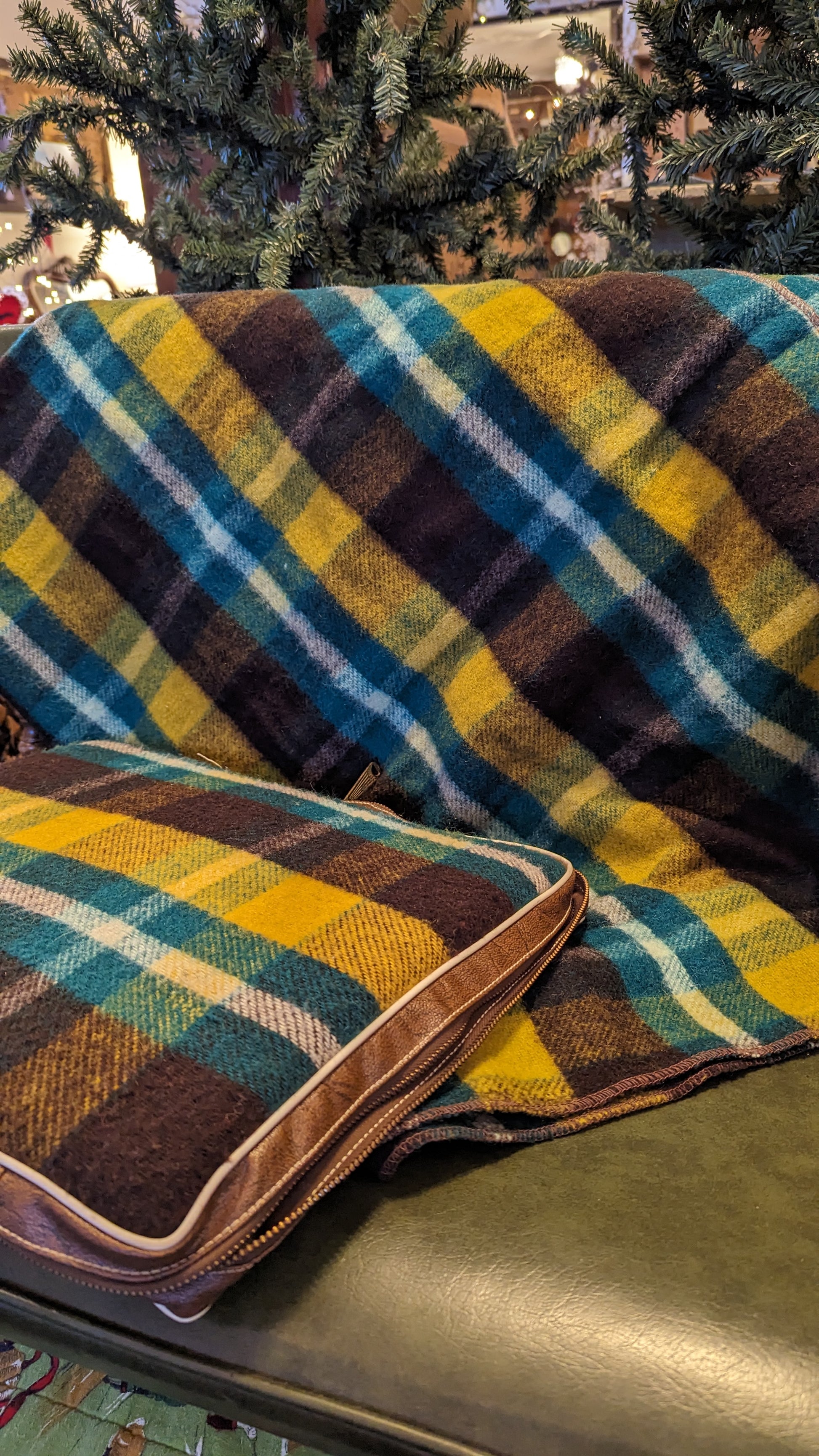 Nice find! A mid-century vintage wool blanket / throw in appealing brown, green, and yellow plaid - with matching zippered carrying case. The blanket can tuck into the case for a comfy cushion while seated on the bleachers, or enjoy at the tailgate / cookout, or at home, cabin, camp, cottage!