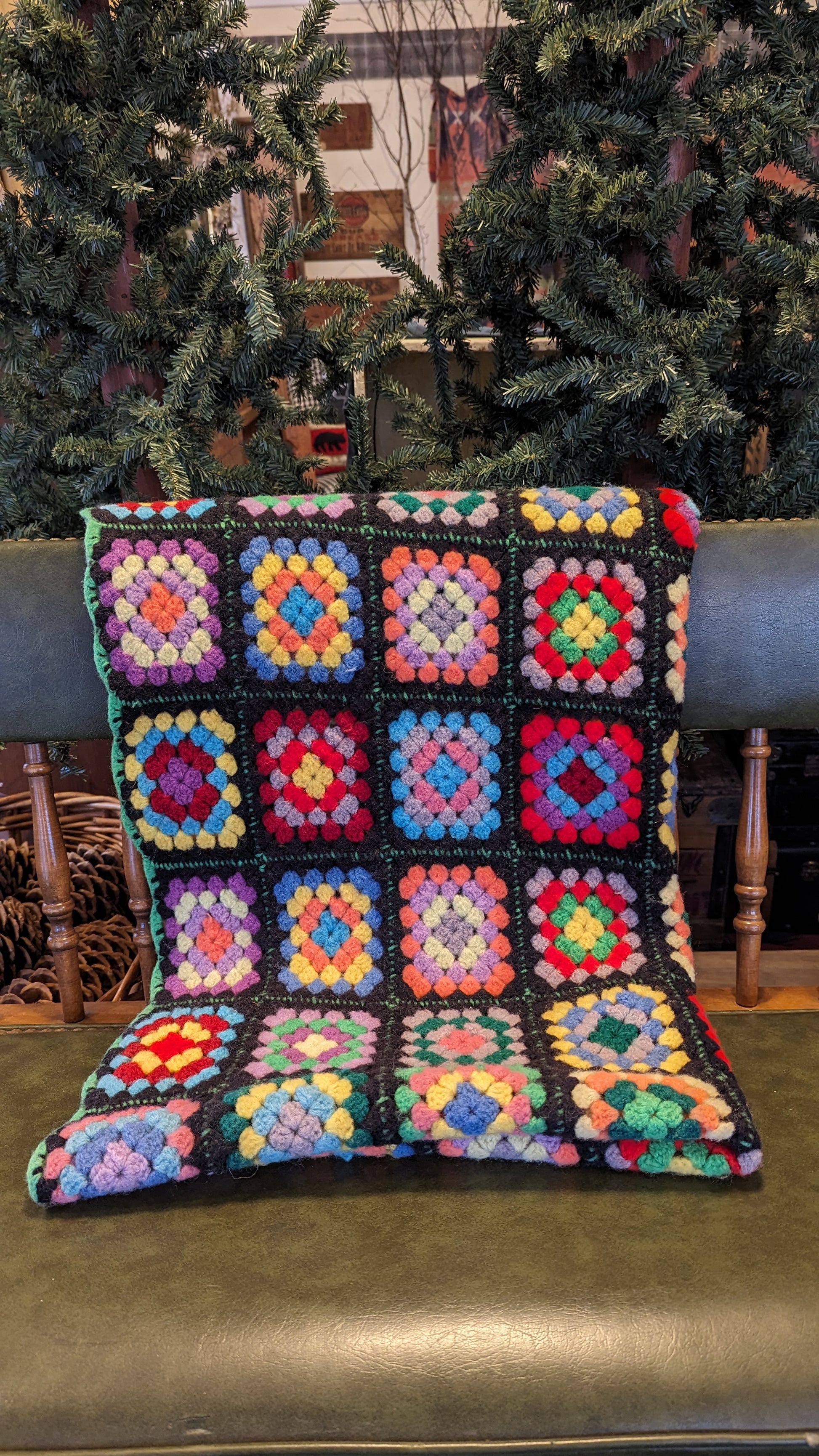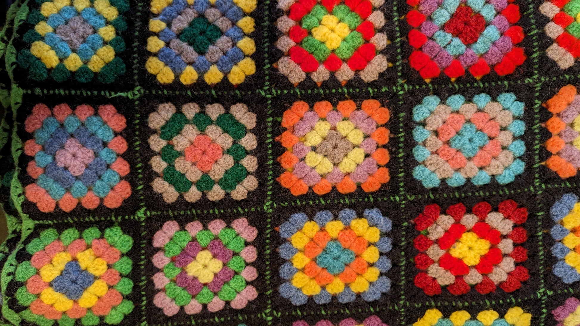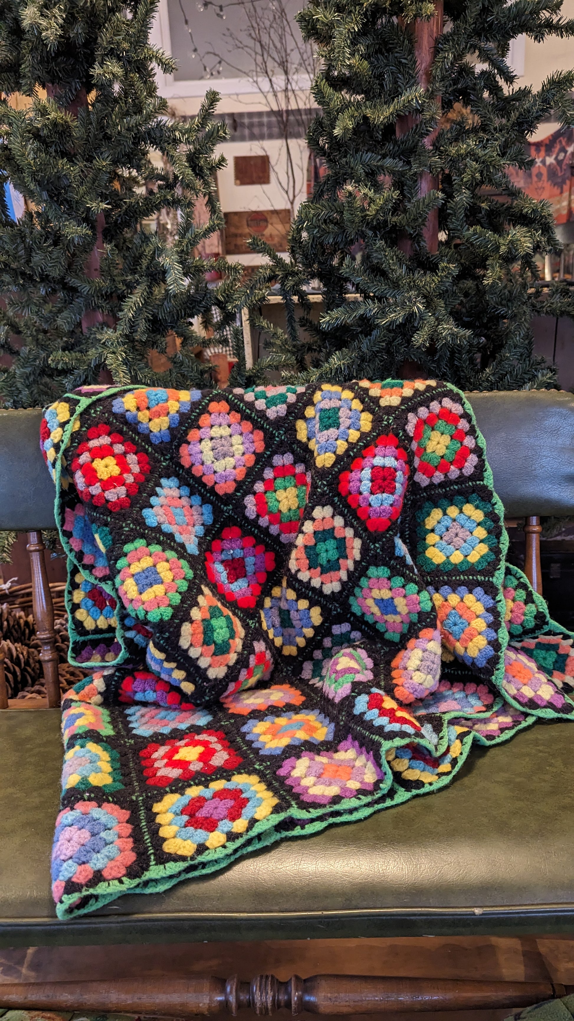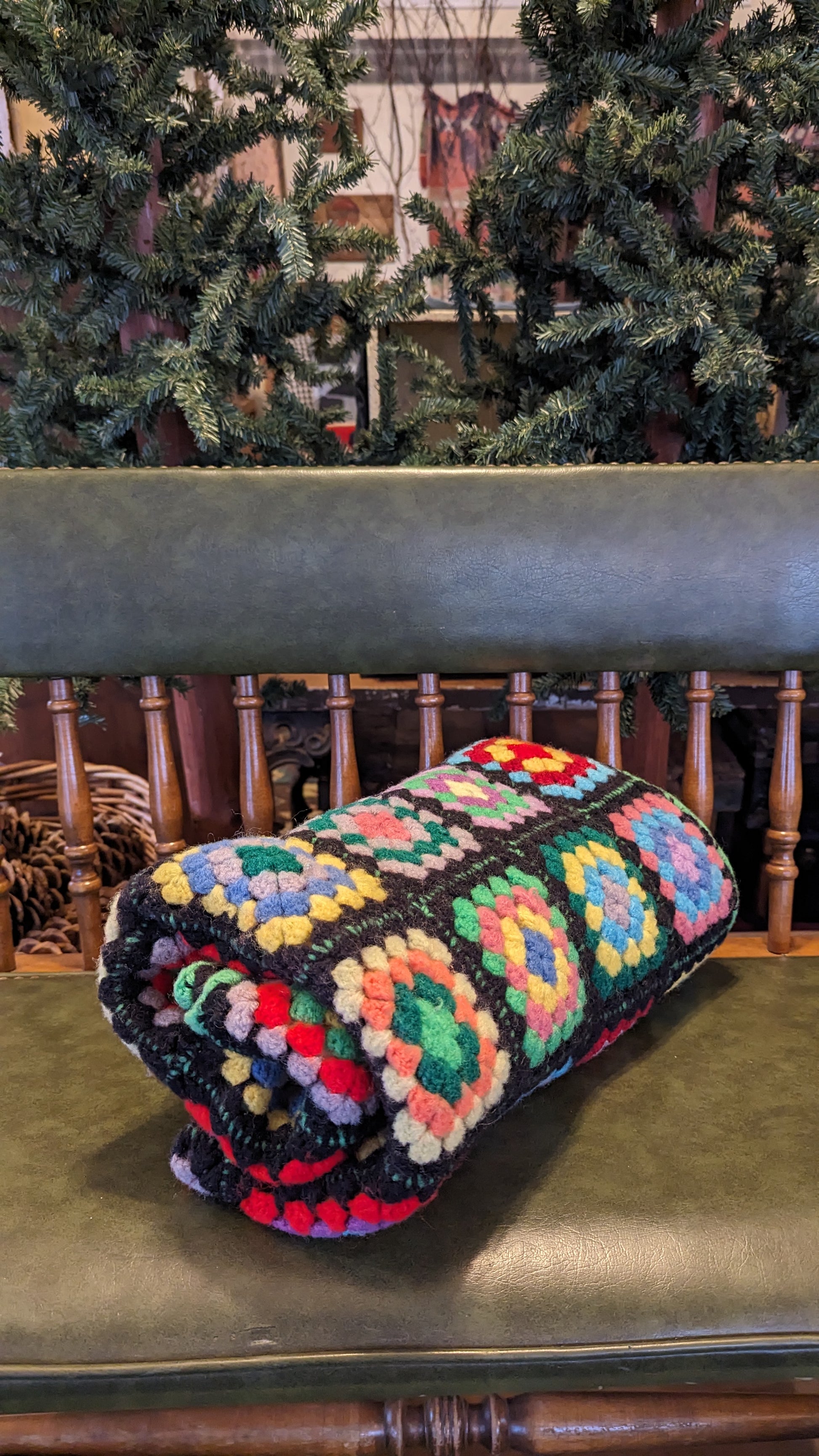 Mid-century vintage handcrafted throw in the ever popular Granny Squares pattern, all crafted in colorful wool. Sized just right for the couch or an outing, at 56 inches x 31 inches.